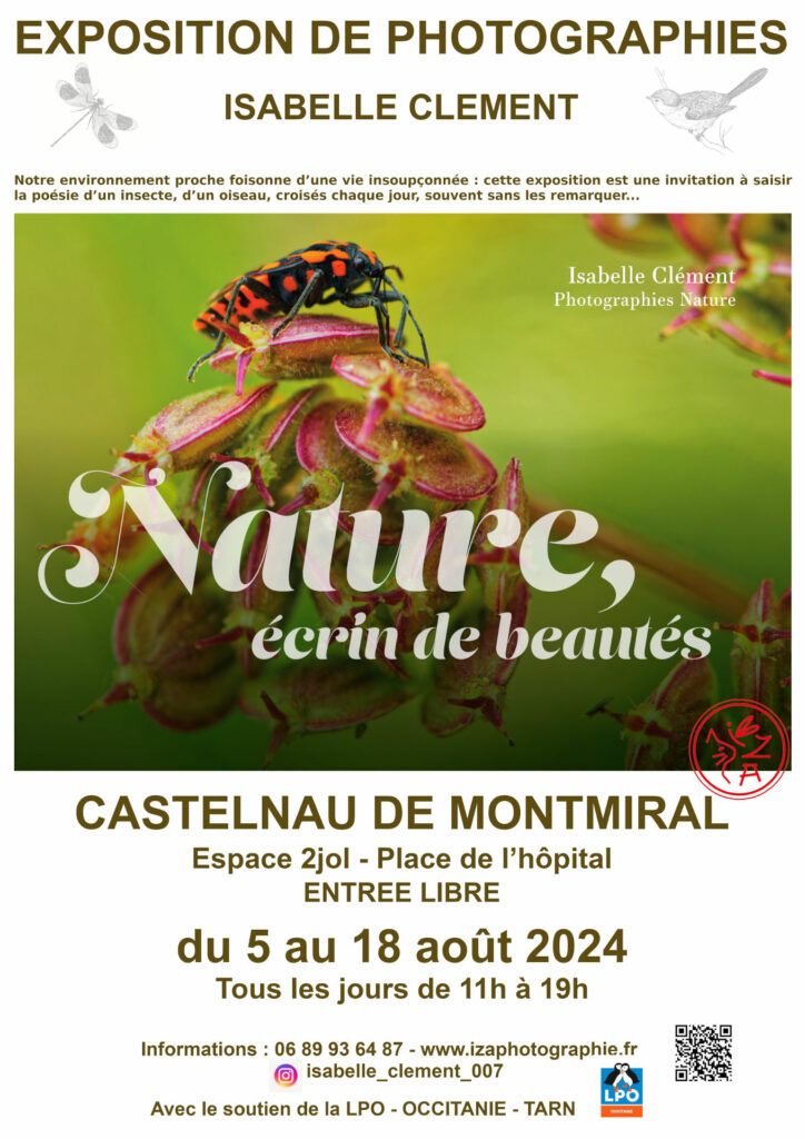 Avec le soutien de la LPO Occitanie – Tarn, j’expose une cinquantaine de photographies d’insectes et d’oiseaux, à la galerie 2jol de Castelnau de Montmiral.